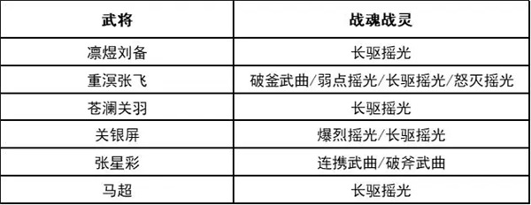 武将:凛煜刘备(赵云护法)、重溟张飞(关羽护法)、苍澜关羽(关平护法)、关银屏、张星彩、马超