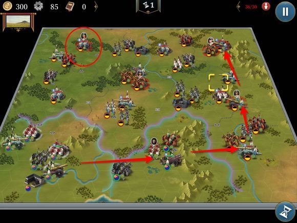如图线路,在打下第一个红圈后,可以分兵推下面两个城,主力在红圈附近清兵并消灭俾斯麦。然后一起打毛奇。最后推上方红圈就可以了。