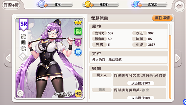 3、召唤获得的武将我们可查看她的详细信息,方便在后续进行阵容搭配;