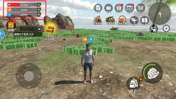 4、随时注意你的饱食度,口渴度和血量,一旦血量归零游戏将会结束