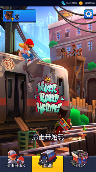 操作也很简单:点开游戏就能开始,滑动屏幕控制跳跃、下蹲等动作。你可以选择不同的角色(点击“SURFERS”),还能在“SHOP”里买装备和道具。游戏里的障碍是无限的,地图可以随意切换,每次闯关都有新的挑战。