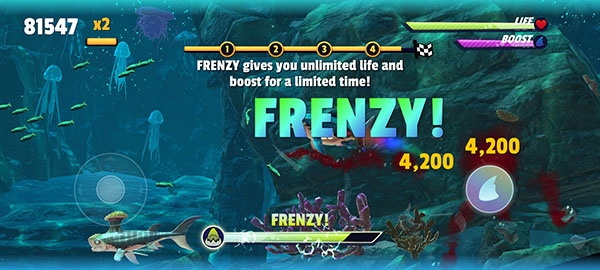 游戏里还有各种有趣的探索元素,比如珊瑚礁、沉船遗迹等,还能捡宝藏和遗物来提升能力。操作很简单,用虚拟按键就能控制鲨鱼游动,加速的话还可以用右边的鱼鳍。 hunger 足够时会进入狂热模式,感觉自己变得超级强大,可以横着走吃一切。