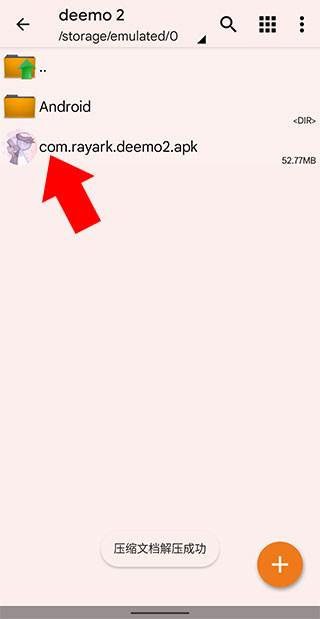 2、使用ZArchiver打开zip压缩包,并将Android文件夹与.apk文件解压至新建的deemo2文件夹中