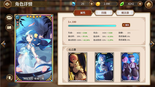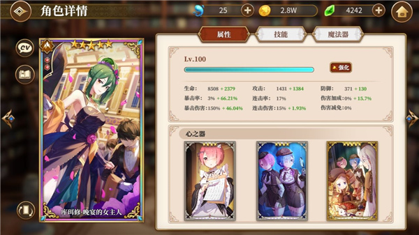 人物评价:由于ap三耗所以基本绑定三号位,消耗实在是太大了,而且要带一些吸血心器,这个人物真的脆,官方打着双修,结果还是只能暴击,现在基本输出高的五星都是暴击流。