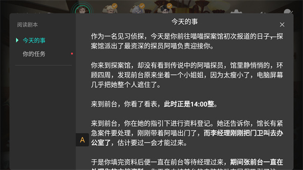1、基础玩法这款喵喵探案馆的核心玩法就是当下非常火的“剧本杀”,它就相当于一个剧本杀的小合集,小伙伴们在里面可以找到各种各样的剧本杀故事,而且剧本的类型是非常丰富的,有一些人热衷的情感本,也有令人肾上腺素倍增的恐怖本,还有烧脑硬核的推理本等等。