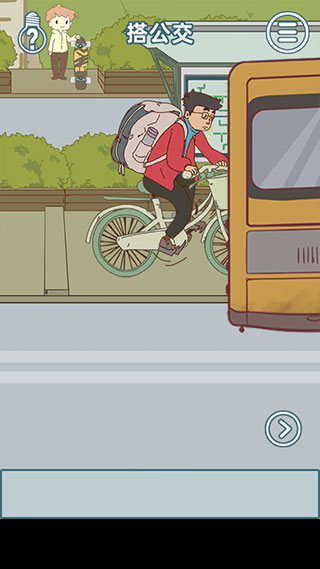 3、第一关“搭公交”,右下角可以切换到下一场景,点击左上角的自行车。