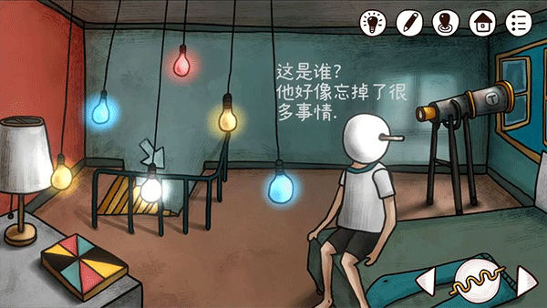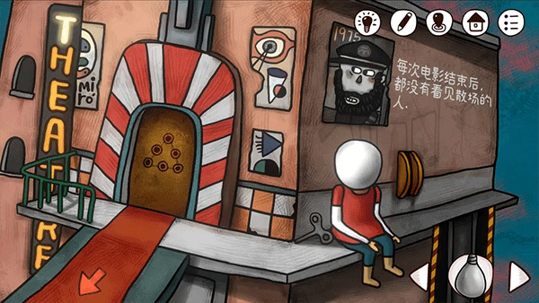 上楼,把发条装在男孩的头里,点击发条,获得电影院大门密码(灯泡的颜色就是密码)