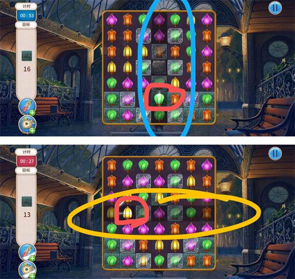 连续消除六个会随机点亮一个横向或者纵向的灯。再消除点亮的那一组(三个以上)就会消除整一列或者行。多玩几次熟悉就好了,蛮有意思的。