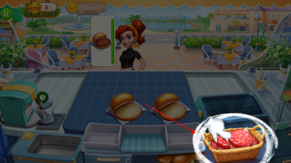 6、即可放置在汉堡胚中,点击可将汉堡给到顾客