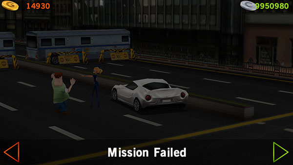 9、如果未能及时拨正方向盘,则很有可能造成【交通事故】,这时候游戏也就结束了,点击左侧箭头返回,右侧箭头继续。