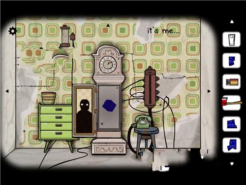 我们依然先是默认的面对有大型钟的这面,在盆栽柜子上拿到望远镜,然后一直点击盆栽,就发现一直手深了出来,又缩了回去,可以拿到第一篇相框碎片。抽屉里面可以取得螺丝刀,火柴,柜子边上还有一片碎片,房间钟的上方也可以取得一片碎片。