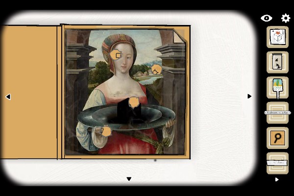 16、打开文件。根据纸片的提示,用雪茄烫在画像相应的地方上(按顺序分别是:黑方块上方、左手上、屋子和左眼)先记住,以后有用。