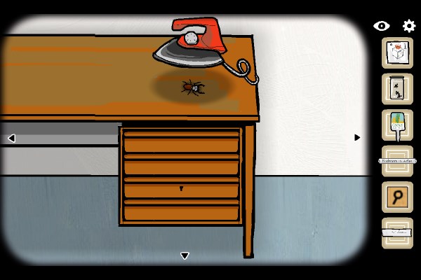 10、弄开女尸脸上的头发,点击嘴爬出来一只甲虫,点击甲虫跟着它走。等它爬到桌子上的时候,拿起熨斗把它拍扁。点击虫尸拿到钥匙