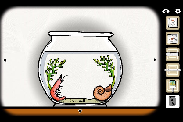 8、把罐子里的小虫放进鱼缸。点击左边的水草让虫子掉进贝壳里,然后贝壳里会出来一根手指把虫子点亮后戳出来。把变亮的虫子喂给鱼吃,鱼吃后会变成一把钥匙。
