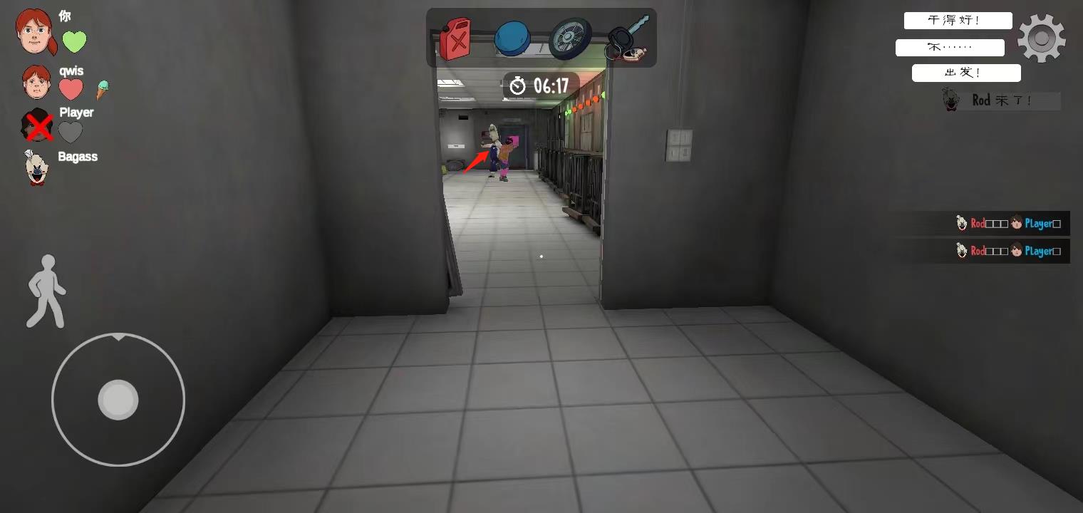 按照教程下载安装后,注册并进入练习模式熟悉玩法,然后就可以开始正式的游戏了。操作简单,左边控制移动,右边控制视角,注意躲避罗德。拾取道具需要点击“手”按钮,遇到车库门和货车时就能逃离。多人联机的话可以创建私人房间,通过分享ID邀请小伙伴一起玩。