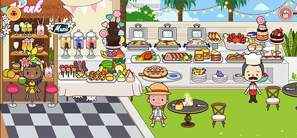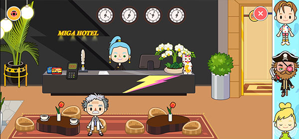 游戏有六个场景,每个都有独特的设计和惊喜。比如豪华套房带超大浴室和无敌海景,主题房间还有花仙子童话风格和汽车主题。海滩上可以找宝藏,观光区能买纪念品做面具,拍照片留念。