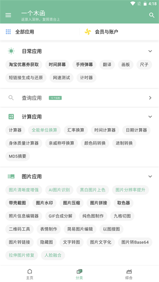 请你想象这样一款APP,就像一个工具箱,分成好几个格子,不同的格子里面放有锤子、剪刀、螺丝刀、手电钻、热熔胶枪...这款APP里面也分成了好几个”格子“,有图片工具的格子,有设备工具的格子,有清理工具的格子,还有转码工具的格子...每个格子里面都有对应的“工具”,图片工具的格子里有二维码转换制作,表情包制作、图片转换、图片拼接、以图搜图等工具,清理工具的格子里有安装包清理、大文件清理、内存清理等工具...总之,这个工具箱一样的APP里,藏着你日常工作学习生活中可能会用到的各种各样的工具,能够满足你各种各样的需求:当你需要某一样工具的时候,不需要上网找专门的软件或者网站,只需要打开这个APP,找到其中对应的工具,直接就可以使用。小编今天要给大家推荐的就是这样一款安卓的APP--一个木函国际版,软件里面的工具分成了“日常工具”、“图片工具”、“设备工具”等六大类,每一类别下面都有十几种对应类别的工具,十分好用。