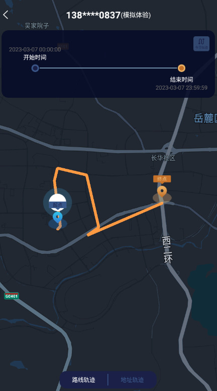 2、下方选择路线轨迹,可以查看好友走过的路线图。选择地址轨迹,可以查看路线上详细的地址名称。