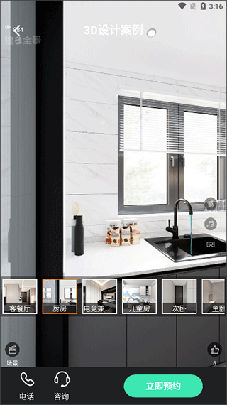 3、然后可以看到该案例的3D模型,点击左下角场景按钮,可查看不同房间设计