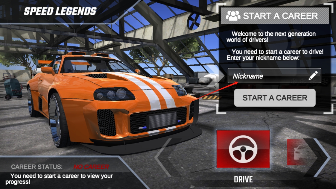 2、然后就来到了这个奇妙的游戏世界,下图这款经典的橙色汽车就是玩家的测试车,可以帮助你开始驾驶,但是玩家还需要去汽车商店买你的第一辆车,点击下图的【drive】;