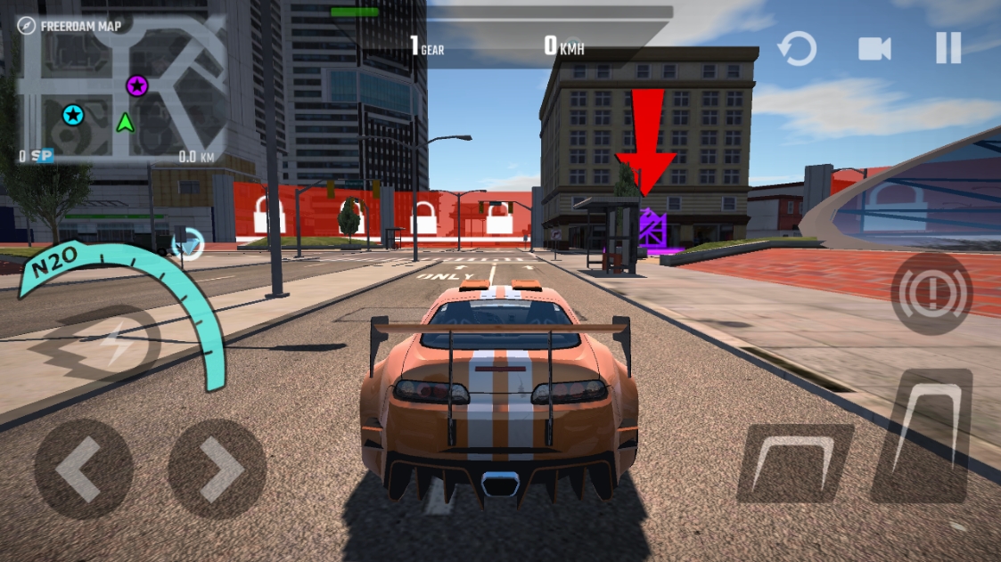 4、进入游戏以后,左边控制车辆的左右方向,右边则是油门、刹车,在你的周围会有几个挑战,需要完成它们来赚钱,然后买你的第一辆车,现在玩家可以开始寻找红色箭头;