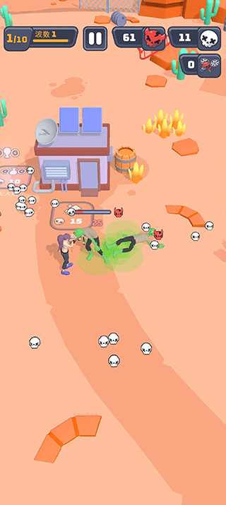 游戏里的资源收集也很重要,不仅要战斗,还要保护营地不被攻破。每次击败僵尸都会掉落头骨,用来升级攻击力或者购买无人机,这些都能帮助你更好地闯关。游戏玩法简单但很有挑战性,随时随地都可以开玩,体验一把末日生存的紧张刺激感。