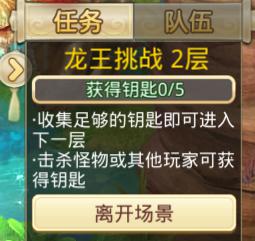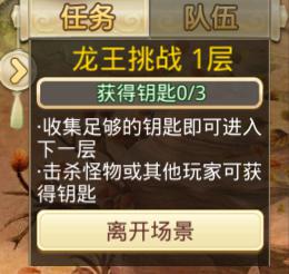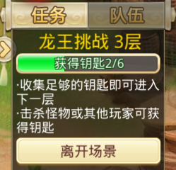 此时玩家会被传送到三阶守护神处,点击NPC进行对话,选择“送我过去吧”进入场景,进入场景后右边任务栏会显示一个进度条,需要获得三个钥匙钥匙,钥匙通过击杀怪物或者击杀其他玩家获得,玩家伤害在活动内为固定伤害。