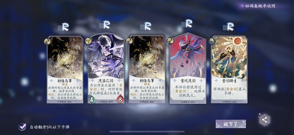 游戏里的卡包称之为“秘闻卷”,可以开出随机某个式神的随机五张卡片。
