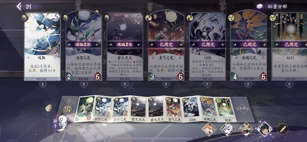 每个式神有多种不同效果的卡牌,这些卡牌决定了式神的战斗方式,随着游戏更新,每位式神牌库也会不断更新。