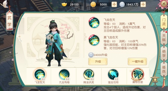 每个门派都有极具特色的技能:4个普通技能,4个强化技能,1个终极技能;4个普通技能和4个强化技能一一对应;门派技能随着等级提升解锁,通过消耗银币可以提升单个技能等级;