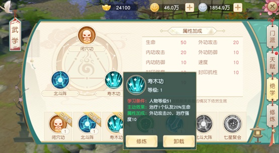 每个绝学都有特有的效果,总共三个位置可以装备绝学,战斗中使用绝学主动效果;学习绝学后可以为主角增加属性;绝学未装备时,属性也会生效;