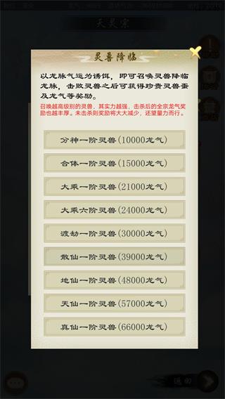 需要龙脉道场的尊主或者副尊主消耗一定的道场气运,可获得灵兽修为丹,气运以及龙气。而消耗的气运和可获得的奖励都随着灵兽的修为增加而增加,如果未能击败的话,奖励就会大大减少,所以根据自身实力合理选择灵兽的等级很重要。