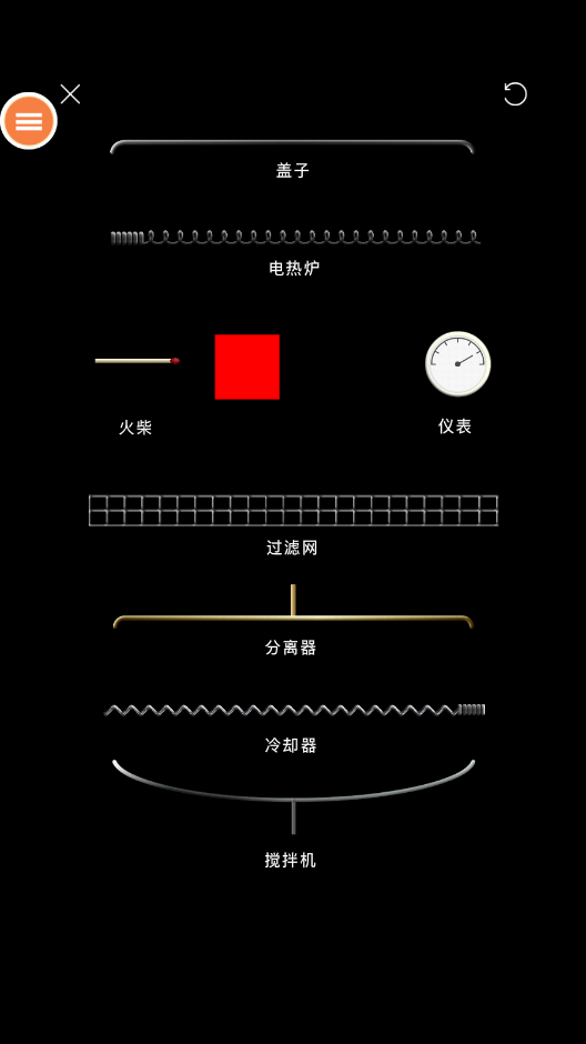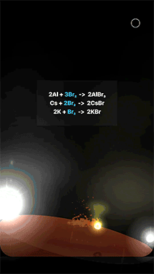 点击右上角的圆圈可以打开物品列表,App 内拥有 150 种化学元素,包括液态、气态和固态的化学物质。大家可以随心所欲地添加它们,尝试在不同环境下它们发生的不同变化,了解操作步骤,在实验中加深知识印象,顺便还能复习一下化学反应式。