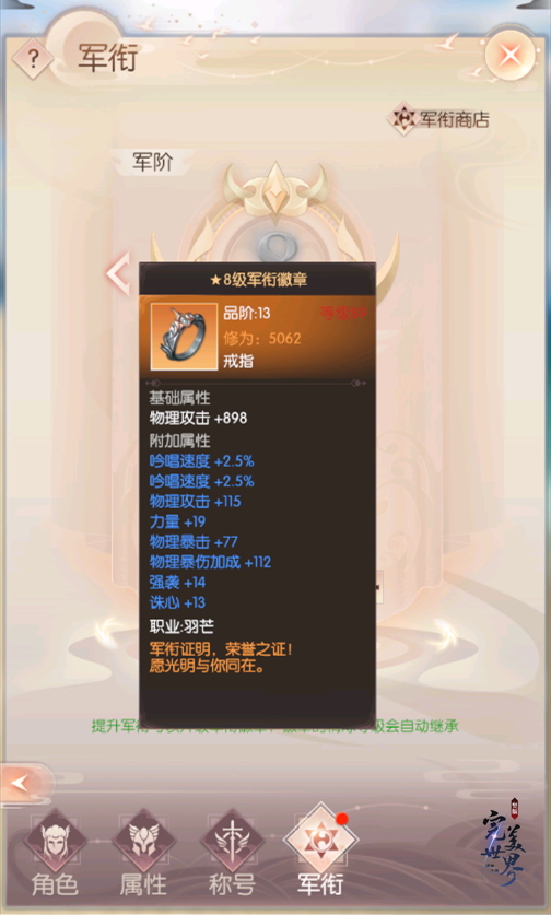军装是靠刷声望升级,在达到八军后,军装威力开始凸显。“八军”是什么,当声望达到100000即可解锁八军,解锁八军后可获得89级13品橙装戒指“八阶军衔徽章”,或者在军衔商店购买89级13品橙装衣服、裤子和武器,八军装备是可以打造升级的,可进阶为95级的14品乃至99级的15品橙装,超强的属性加成才是八军装备的真正耀眼之处!
