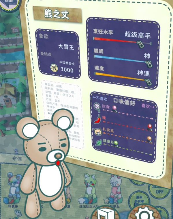 游戏中,玩家需要带领可爱的布偶玩偶经营餐厅,制作美食吸引顾客,提升收益。升级系统能解锁更多功能,如兼职和音乐厅,同时还能通过收集布偶动物来提升餐厅星级。为了提高营业额,玩家可以使用特定菜式刷客流量,但需要注意不要强行改变店铺口味偏好。
