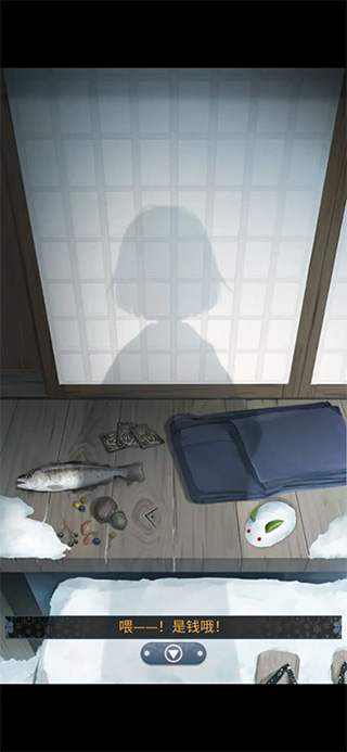 把点亮的油灯拿到拿衣服的房间,地板下面石头旁边有一个黑暗的区域,用油灯点亮得到钥匙,用钥匙打开箱子得到钱,把钱放到门口,过剧情