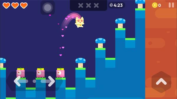 第1关:游戏操作界面介绍,底部是方向键和跳跃键;顶部是血量、收集的星星和方片。经过第一个小怪物之后,跳到上面,跳起来顶碎障碍物吃到第一个星星。这里是一个隐藏路径,从下面将绿色的方块顶上去,然后借助绿色方块吃到上面的第二个星星。存档点。又碰到喵星人,顶开墙,这里吃到一个血点。继续前进,躲开或者跳起来踩死小怪物,跳到最高处,吃到最后一个星星。继续前行,然后过关。第2关:蓝色?可以顶,出现提示,然后继续沿着箭头前进。下来,隐藏通道中碰到机器人,机器人自动移动,借助机器人跳的更高,上去。跳上去,碰到黄色喵星人,得到一个技能——子弹,技能有cd。往前走,用子弹清扫前进中的障碍物,上面吃到第一个星星。存档点,打开机器人旁边的障碍物,机器人走下来,借助机器人跳上去。吃到第二个星星。用子弹推动封路的障碍物,借助这个障碍物跳到右边。跳上去,左走吃到第三个星星。往前前进,过关。