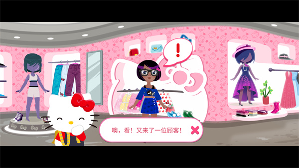 2、来到凯蒂猫的服装店铺,点击“!”接待第一位顾客。