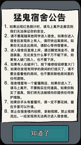 1、宿舍选择:在游戏里面宿舍的选择很重要,选择宿舍注意2点,一个是门要在上方的位置,二尽量选择较远的位置,选择门在上方的位置是因为猛鬼在攻击的时候可以清晰的看到门的血量,如果门在下方的话可能会和猛鬼并合在一起,这样就无法看到门的血量了,偏远位置可以让猛鬼不会第一时间走到玩家这里进行攻击,优先攻击其他队友的房间;2、升级优先度:找好宿舍后优先提升床的等级和建造两个炮台,因为这个时候猛鬼还没有到来,所以优先提升床铺的等级快速获取金币,然后再去提升门的等级,之后床铺的等级可以暂停一下,优先提升门的等级,否则很容易被猛鬼突破,提升到需要电力的时候再去商店购买游戏机,否则会很容易被猛鬼突破;
