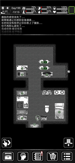 所以里面的角色也是要吃喝拉撒的,但我们可以通过自己的体感判断生理需求,而角色则需要通过查看状态栏来满足生理需求。