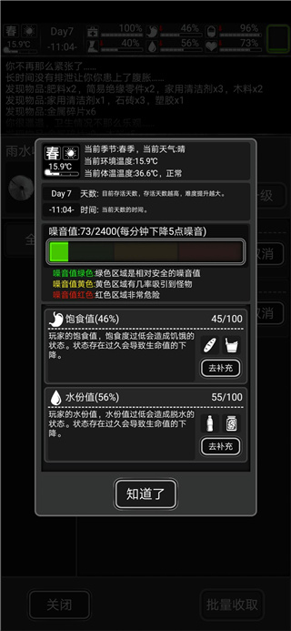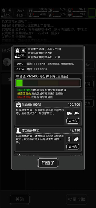 七值指噪音值,生存值,饱食值,水分值,健康值和情绪值后面六值与生存值息息相关,在游戏上方点开即可查看。各位看图就行。
