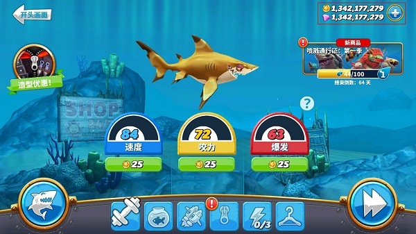 升级你的鲨鱼装上超酷的装备,咬合更用力、游的更迅猛变得更贪婪!每只蓄势待发的鲨鱼都需要、耳机、雨伞还有超炫的喷射背包!
