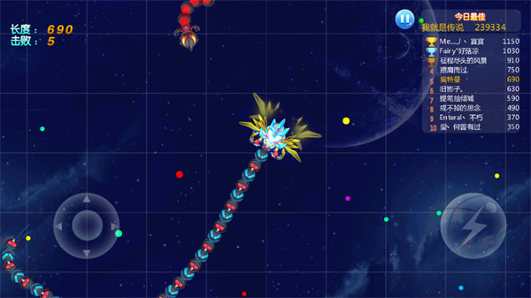 1、控制摇杆走位你的小蛇,吃掉地图上彩色的小圆点,就会变长哦。