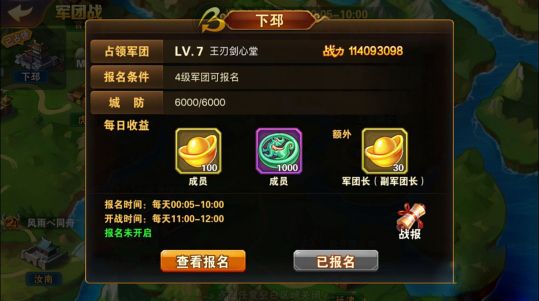 满足条件军团的团长和副团可以在世界地图里选两个计划拿下的城池,普通玩家也可以通过点击城市图标来了解城市防御、报名及开战时间、当前报名状况以及占领收益等城市信息。