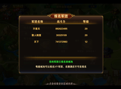 每个军团可以同时报名参与两座城市的争夺,目前的机制采用报名时间先后顺序判断,也就是每座城市最先报名的三支军团可以参与城池争夺,后续版本中会修改为按照军团的贡献度排名进行报名。