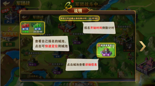 军团战开始前十分钟,玩家可进入本军团报名的城池准备战斗。开战后会预留一段时间供军团成员加入战场。