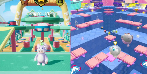 元梦【潮起潮落】的玩法亮点是起伏不定的波形障碍墙和伸缩的踏脚板,而蛋仔【波涛迷宫】同样是起伏不定的迷宫,虽然画风和地图背景有所差异,但核心设计相同。作为蛋仔的老地图,虽然画面上稍逊一筹,但设计却和后来的元梦一样成熟,可见蛋仔功底还是更高。