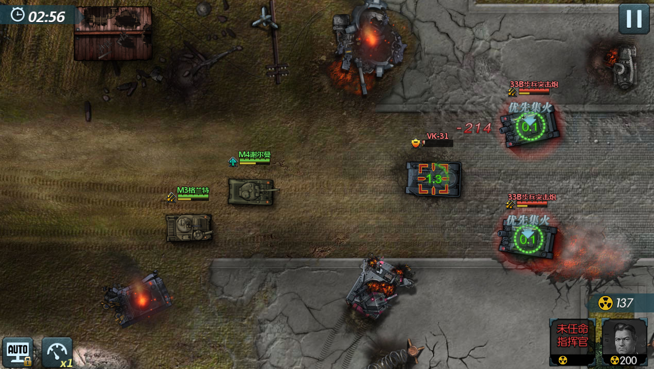 战斗中,系统提供坦克的自动行走和攻击,但用户可以手动选择优先集火攻击目标,从而更快的通关。在整个战斗过程中,重要的地方单位下部会出现黄色和红色的光圈,提示玩家选择集火攻击。