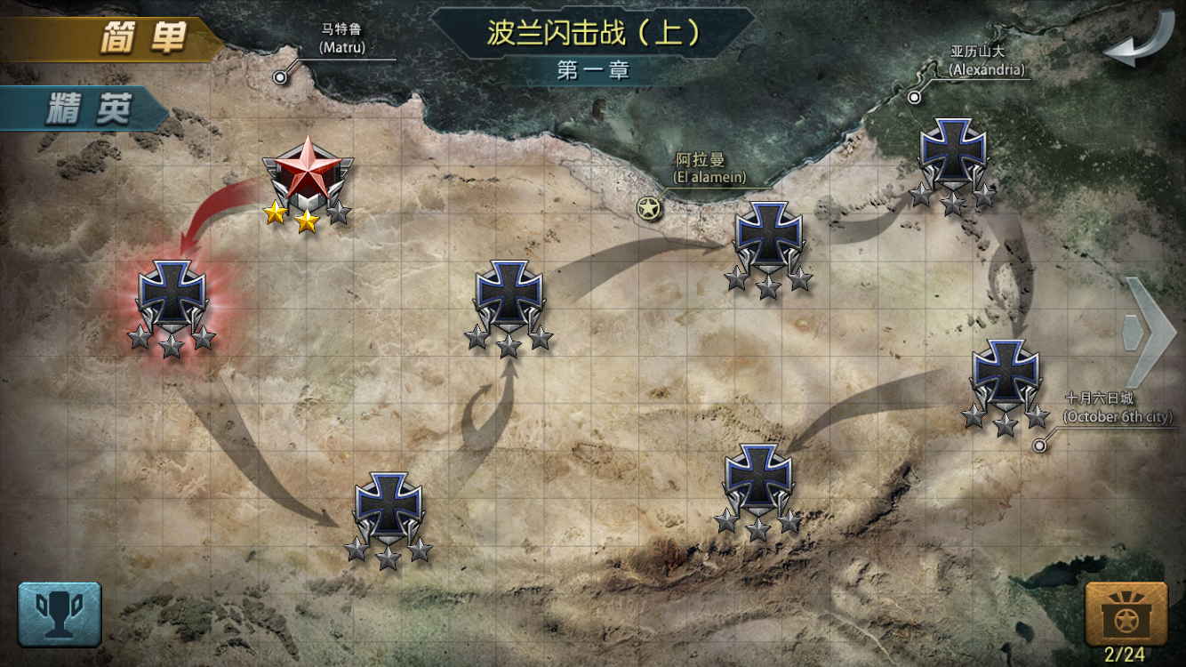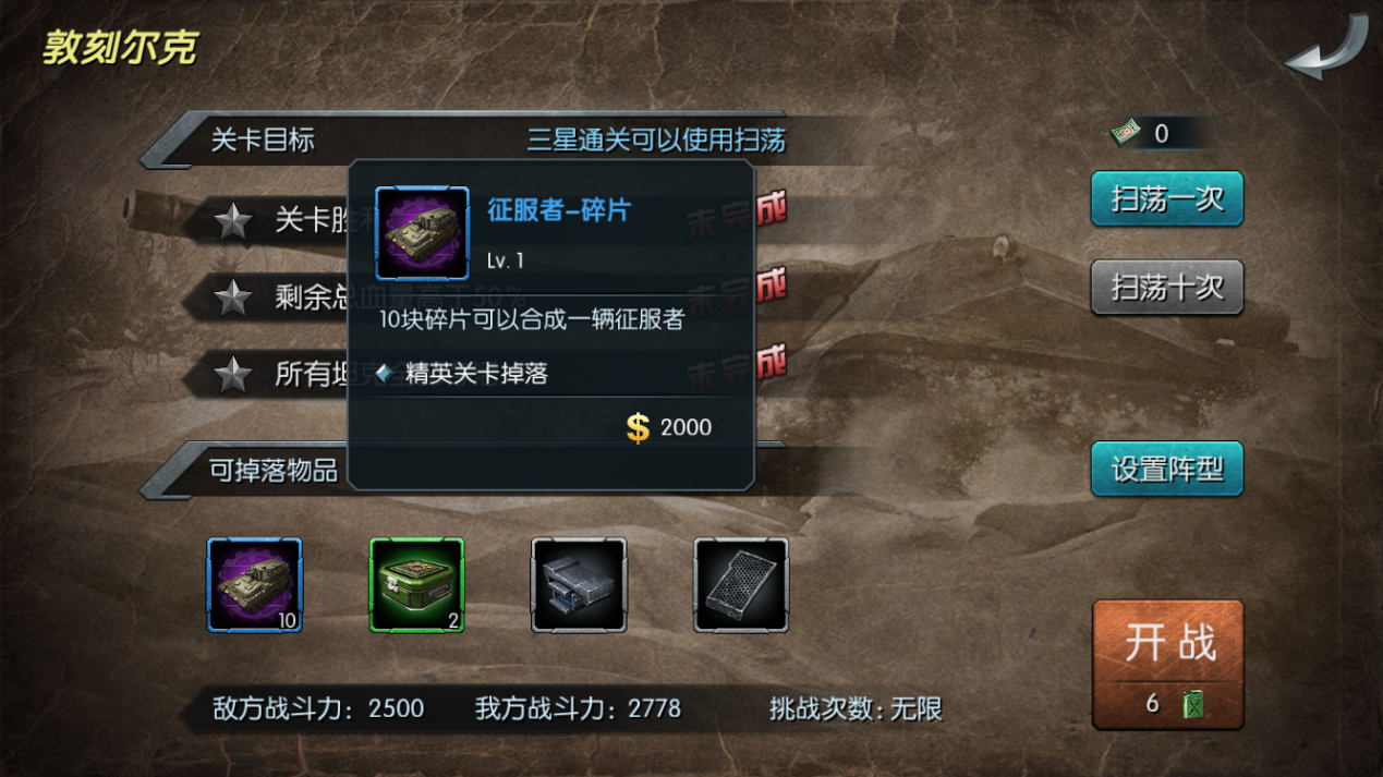 进入精英关卡界面,会看到不同关卡的掉落信息,找到想要搜集的坦克碎片。努力通过关卡,获得胜利后的奖励中有一定几率会掉落该坦克碎片。