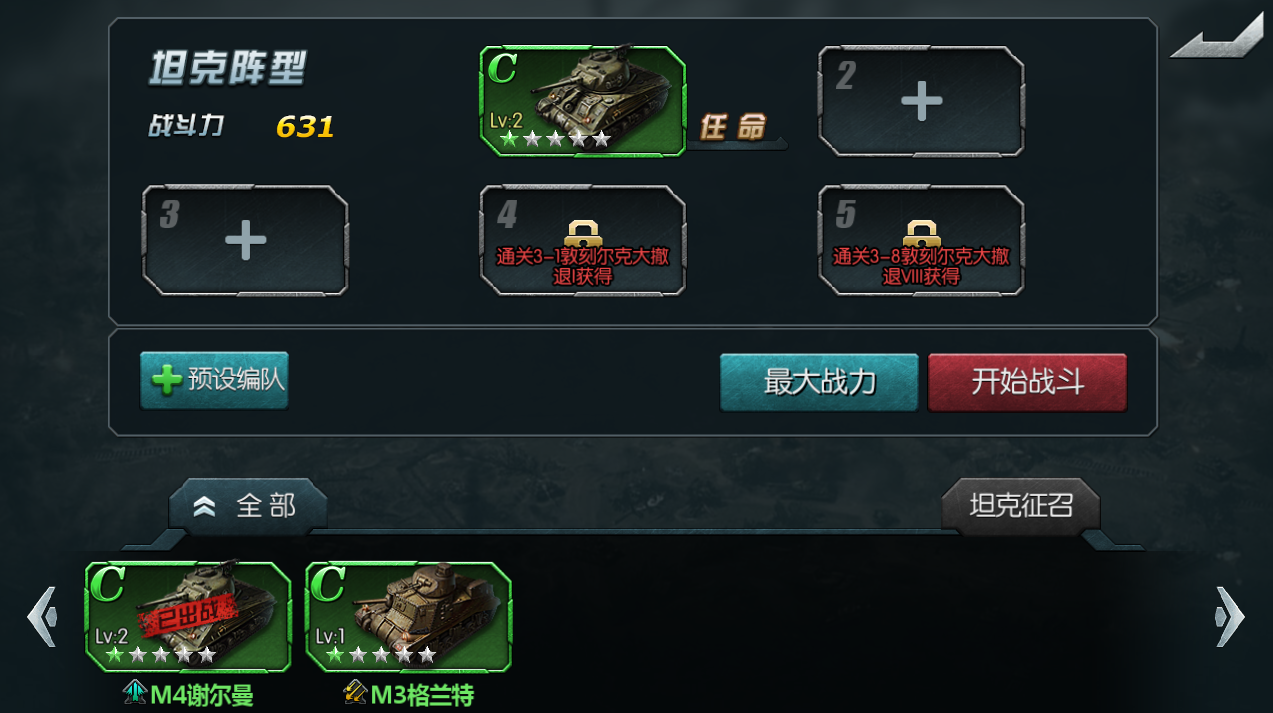 进入关卡后,首先要进行的就是出战坦克的选择。玩家只需要选择要上阵的坦克即可,至于坦克的排列顺序,系统会按照规则自动排列。在此,坦克排列的顺序已经按照最优策略排列,避免玩家的不必要尝试和繁琐的操作。